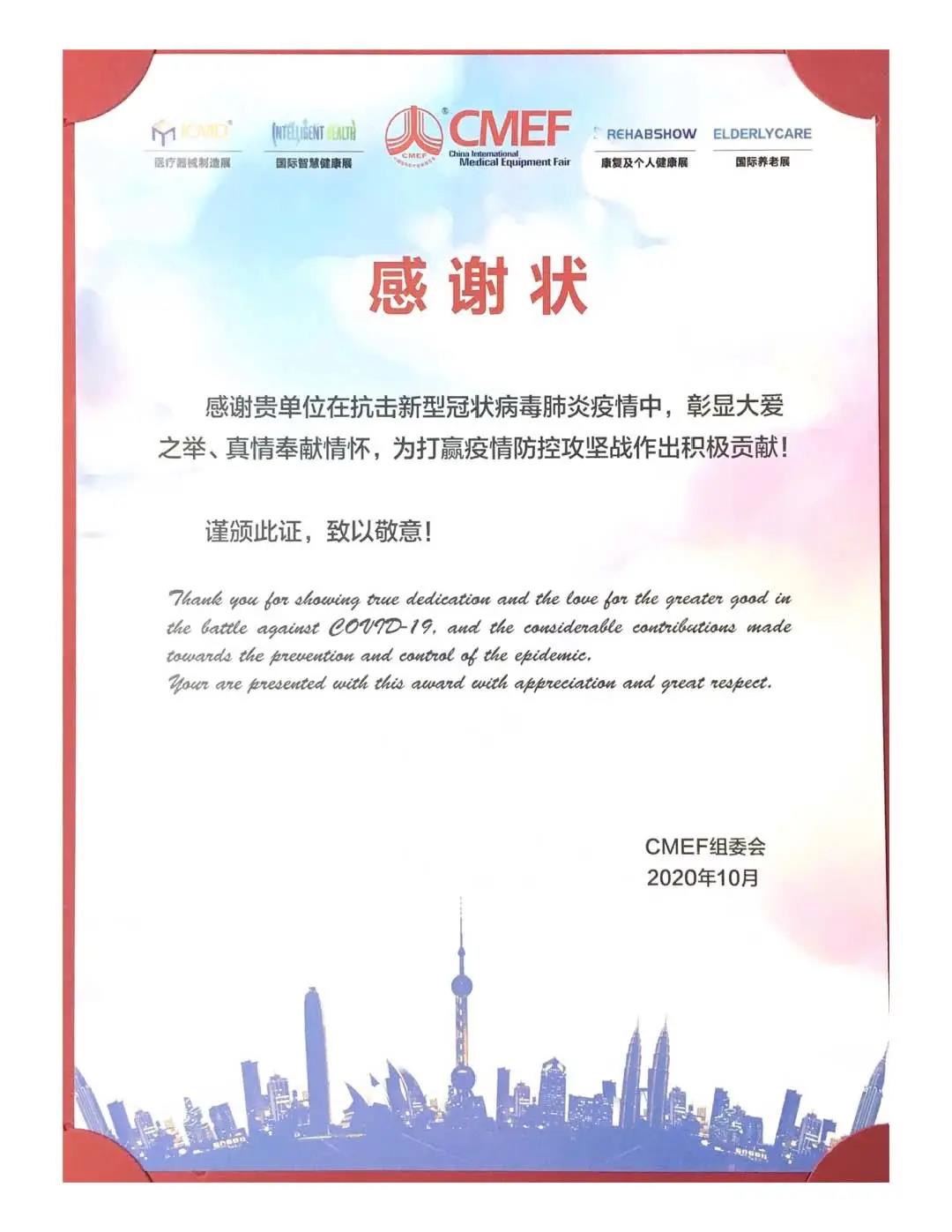近日,倍爾康收到了中國(guó)國(guó)際醫(yī)療器械博覽會(huì)(CEMF)頒發(fā)的感謝狀,感謝倍爾康在新冠疫情告急之時(shí),積極組織員工加班加點(diǎn)生產(chǎn)體溫計(jì),用實(shí)際行動(dòng)助力一線(xiàn)抗疫。